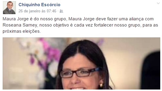 De acordo com o suplente de deputado federal Chiquinho Escórcio (PMDB), em recente postagem na sua página do facebook, a ex-prefeita de Lago da Pedra, Maura Jorge (PTN), faz parte do grupo político da família sarney e fará uma aliança com a ex-governadora Roseana, visando a disputa majoritária das próximas eleições ao governo do Maranhão.