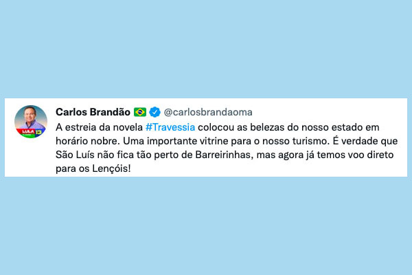 “A estreia da novela Travessia colocou as belezas do nosso estado em horário nobre. Uma importante vitrine para o nosso turismo. É verdade que São Luís não fica tão perto de Barreirinhas, mas agora já temos voo direto para os Lençóis!”, disse Brandão.
